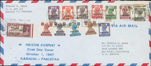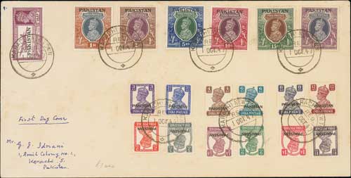1699 image1947 (Oct 1) First Day Cover bearing 3p - 25r Pakistan overprint set of 19 all tied by Karachi New Town datestamps, minor toning, otherwise fine and very scarce, very few F.D.Cs were sent with the 5r - 25r values. Photo on Page 200. (Image1)