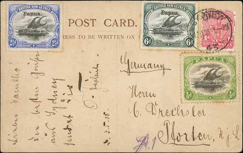 1725 image1908 (May 4) Real Photo picture postcard of East Cape Natives franked Papua large overprint 6d, small overprint 2½d and 1907 ½d, and a New South Wales 1d, posted from Sydney to Germany, the Sydney c.d.s tying two Papua stamps, unusual. Photo on Page 206. (Image1)