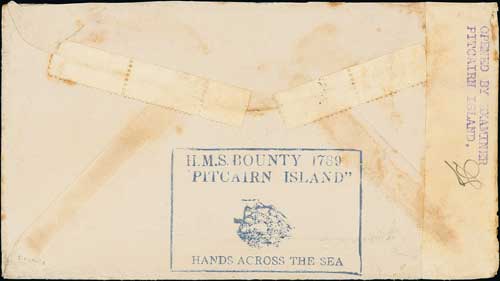 1737 image1944 (Aug 2) Cover from R.P Clerk to the USA with two 2d stamps, reverse with violet boxed "H.M.S BOUNTY 1789 / "PITCAIRN ISLAND" / HANDS ACROSS THE SEA", censored on the island with the rare locally typed label "OPENED BY EXAMINER / PITCAIRN ISLAND" initialled in manuscript. Photo on Page 206. (Image1)