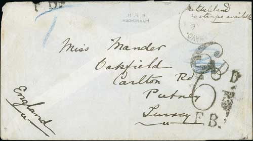 1740 imageFirst Matabele War. 1894 (Feb 16) Stampless cover to England endorsed "Matabeleland, no stamps available" with "GUBULUWAYO" c.d.s and "6d" charge mark, crossed out in blue crayon and marked "T", another single rate 6d charge mark applied in London, backstamped at Vryburg (Mar. 5) and London. A fine and scarce campaign cover from the first Matabele War. Photo on Page 206. (Image1)