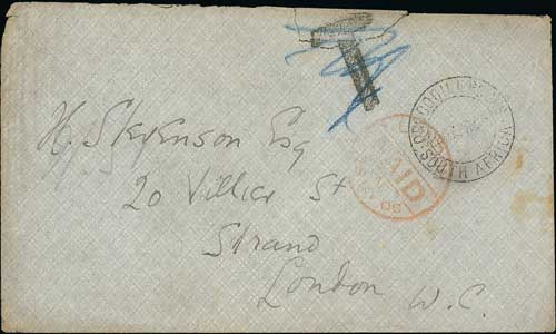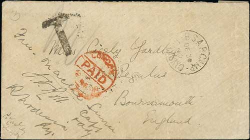 1743 imageBoer War. 1900 (Apr 20) Stampless cover to England with "CROCODILE POOLS / SOUTH AFRICA" c.d.s (used at the Base Camp Post Office at Gaberones) and large "T" applied at Bulawayo (crossed out in blue crayon), red London Paid arrival c.d.s (May 25), small opening tear at upper edge, otherwise fine. Photo on Page 206. (Image1)
