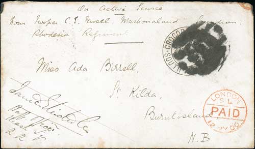 1742 imageBoer War. 1900 (Mar 27) Stampless cover to Scotland headed "on active service, from Trooper C.E Favall, Mashonaland Squadron Rhodesia Regiment" and countersigned by a Staff Officer, with large "T" applied in Bulawayo, struck over the "CROCODILE POOLS / SOUTH AFRICA" c.d.s (used at the Base Camp Post Office at Gaberones), both largely obliterated with "F.B" in the London Foreign Branch, Bulawayo backstamp and red London Paid arrival c.d.s (May 12), light vertical crease, otherwise fine. Photo on Page 206. (Image1)