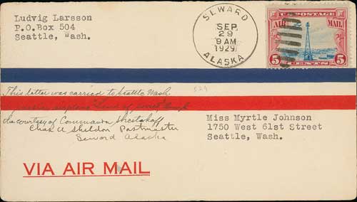 1746 image1929 (Sep.) Moscow to New York flight by the Russian plane "Land of the Soviet", flown cover from Moscow franked 60k in air stamps; and a cover franked USA air 5c cancelled at Seward, Alaska (Sep 29), endorsed "This letter was carried to Seattle, Wash. on russian airplane "Land of Soviets" through the courtesy of Commander Shestakoff, Chas A. Sheldon, Postmaster, Seward Alaska" with Seattle backstamp (Oct .14). Very scarce, very few covers flown from Seward. (2). Photo on Page 206. (Image1)