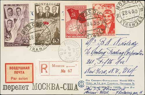 1748 1939 (Apr 28) Moscow to New York non-stop flight, forced to descend in New Brunswick, registered picture postcard (Lenin's tomb and Kremlin) with four stamps totalling 230k, Moscow and "MISCOU LIGHTHOUSE / N.B" datestamps, straight line flight cachet. Fine and scarce, 32 postcards flown.