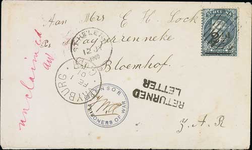 and Returned Letter Office Cape Town (Feb. 8), endorsed "Unclaimed", black "RETURNED / LETTER" applied in St. Helena. An unusual cover (included in the same mail at Vryburg as the cover illustrated on the front of the recent book by Mabbett &