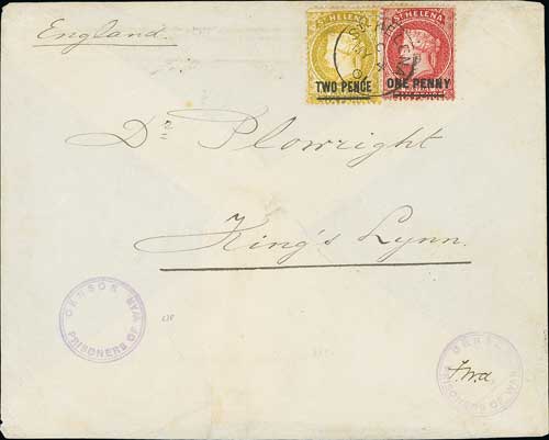 1902 (Apr 17) Cover from Dr. Plowright (collector and author on censor cachets) in Kings Lynn franked G.B KEVII 1d, addressed to Capt. De Witt Hamer at Walbro Cottage, St. Helena, with violet triangular "PASSED /