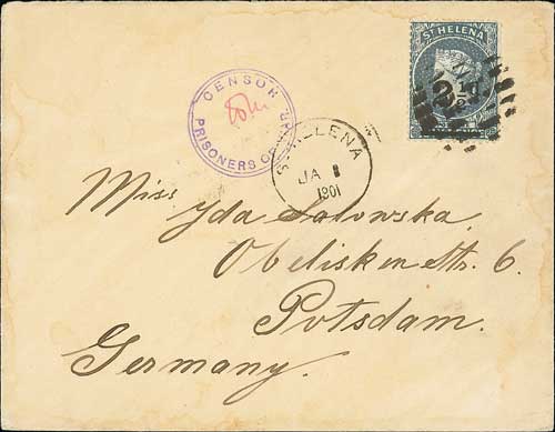 1901 (Aug 27) Registered cover to Germany with 7d postage paid by 2d + 2½d (2) each cancelled by cork type K101, circular framed "R" and oval "REGISTERED / ST. HELENA", violet "PRISONERS OF WAR / CENSOR /