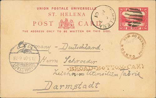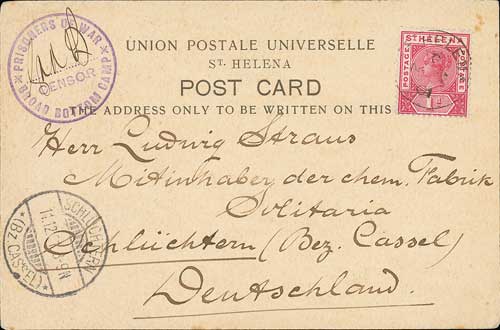 1901 (Nov 12) Picture postcard "Greetings from St. Helena" with the message written and signed by General P.A Cronje, addressed to Germany franked 1d, violet circular "PRISONERS OF WAR / CENSOR / BROAD BOTTOM