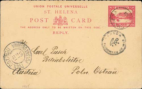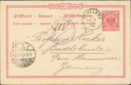 1900 (Feb 7) German 10pf + 10pf reply card posted from Buxtehude (Dec 24) to Colonel Schiel in St. Helena with violet "PRISONERS OF WAR / CENSOR / BROAD BOTTOM CAMP" (BW2, no initials), the attached reply card