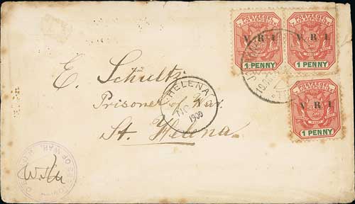 1900 (Oct 19) Cover from Johannesburg franked by three 1d stamps, to "E. Shultz, Prisoner of War, St. Helena" with arrival c.d.s (Nov. 7) and violet type BW1 censor cachet initialled "W.J.M" by Lt. W.J Maule,