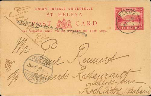 1901 (June 1) German 10pf + 10pf reply card from Dresden (Apr 11) to "Colonel A. Schiel, African Camp, St. Helena" with type BW1 censor cachet (no initials), the attached reply half posted back to Dresden with a brief message in German by Schiel,