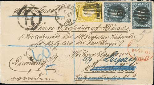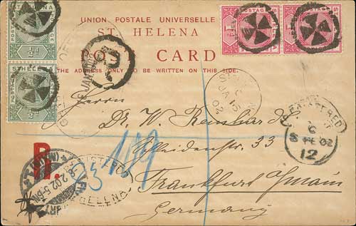 and Col. A. Schiel, registered to Germany franked ½d and 1d pairs each cancelled by cork type K106, circular framed "R" and oval "REGISTERED / ST. HELENA", censored with the very scarce oval "GARRISON OFFICE / 16 JAN 1902 / ST. HELENA" in black