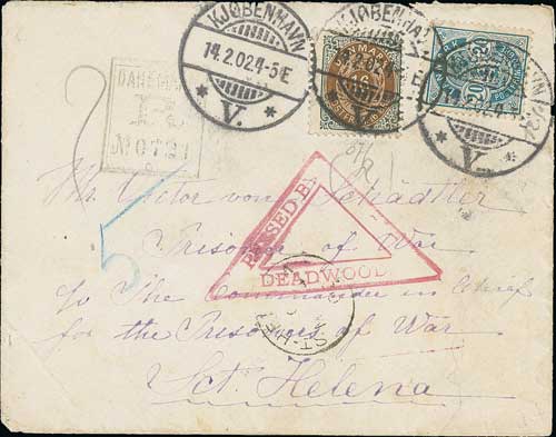 1902 (Feb 14) Registered cover from Copenhagen franked 16ore +20ore, to Victor von Schadtler, P.O.W in St. Helena, with arrival c.d.s (Mar. 4) and red triangular "PASSED BY / CENSOR / DEADWOOD", only recorded in