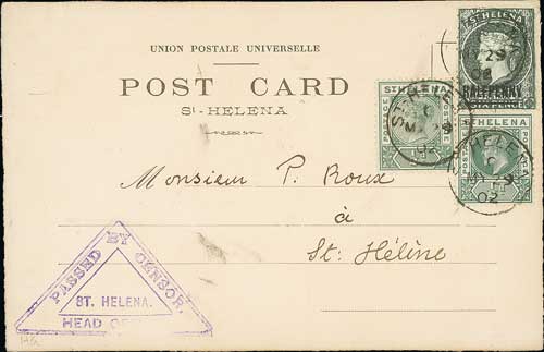 violet triangular "PASSED / BY / CENSOR / ST. HELENA / HEAD OFFICE", fine and unusual. Photo on Page 220. (Image1)