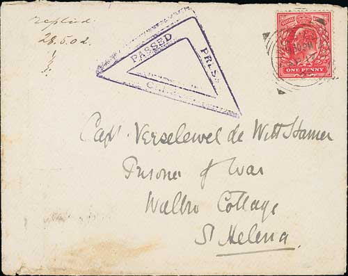 delivered free of charge with a St. Helena c.d.s and type BW1 censor cachet in brown initialled "F.W.A" by F.W Alexander, very unusual. Photo on Page 216. (Image1)