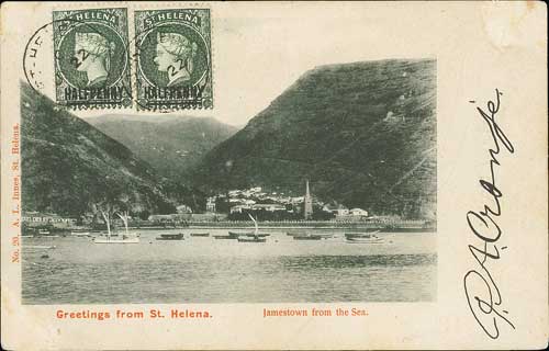 1902 (July 22) Picture postcard "Greetings from St. Helena" addressed to Le Gall, P.O.W at Deadwood Camp, signed on the picture side by General P.A Cronje with two ½d stamps tied by St. Helena datestamps. An