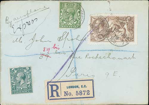 178 image1919 (Nov 10) London to Paris first flight by A.T.&T., cover franked 4½d registered post + 2/6 air fee all cancelled at the London Chief Office, endorsed "By Aeroplane" and "Express", the 2/6 stamp with a corner fault prior to use, otherwise fine and scarce. This was the first official air mail service to a foreign destination; the plane could not cross the Surrey Hills due to fog and had to return, the mail being flown the following day. Photo on Page 24. (Image1)