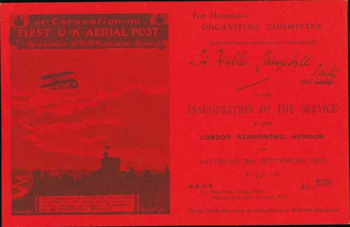 195 image1911 (Sep 9) Red Invitation card from the Organising Committee to attend the inauguration of the service at London Aerodrome, the vignette used on the envelopes and cards printed at left, numbered 255, named to Sir Walter Campbell and party. Very fine and scarce. Photo on Page 24. (Image1)