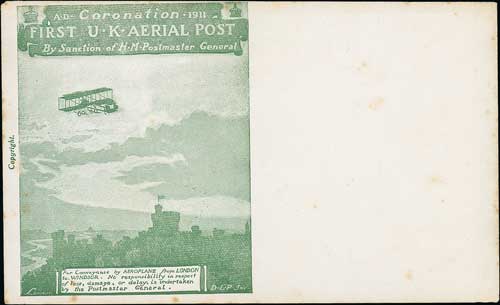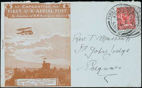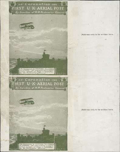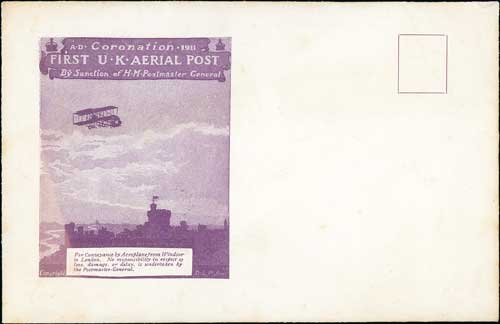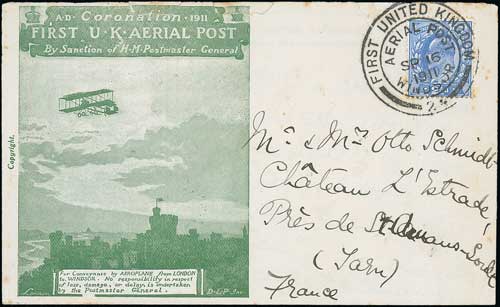 198 image1911 (Sep 16) London to Windsor envelope proof with enclosed notepaper, both in an unissued green colour, curved flap, addressed to France franked KEVII 2½d, flown from Windsor to London with the Windsor code 2 c.d.s, St. Amiens Soult arrival backstamp (Sep 20). Some proofs were sold to the public and postally used when the standard envelopes began to run out, this example flown in the opposite direction to that stated on the envelope. Minor opening tears at upper edge, otherwise fine and very scarce, especially addressed abroad. Photo on Page 28. (Image1)