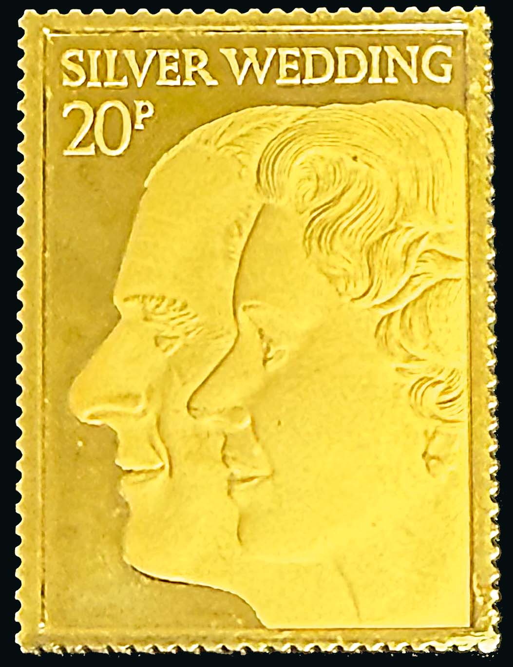 1 image1972 Royal Silver Wedding replica stamps in 22k gold and in silver, London 1972 hallmarks, struck at the Royal Mint on behalf of Hallmark Replicas, number 1382 of an edition of 2,000, in a box, the 22k gold replica weighing 26.63g. Photo above. (Image1)