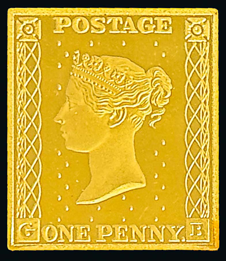2 image1973 22k Gold replicas of the 1d Black and £1 Machin, London 1973 hallmarks, struck at the Royal Mint on behalf of Hallmark Replicas, number 1382 of an edition of 3,000, in a box, the two 22k gold replicas with a combined weight of 34.86g. Photo above. (Image1) (Image2)