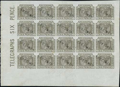 226 image1877 6d Grey plate 1 colour trial, in a deeper colour than the issued stamp, imperforate pane of twenty with "TELEGRAPHS SIX PENCE." in the left margin, each handstamped diagonal "SPECIMEN" type 11, mint, lightly mounted on three stamps only, minor gum wrinkles and tiny thin between two stamps, a rare and attractive pane. S.G. £2,600+. Photo on Page 20. (Image1)