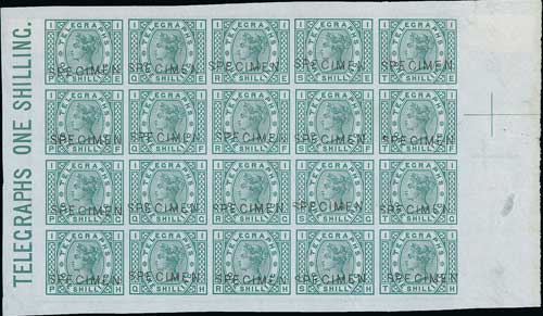 227 image1876 1/- Deep green plate 1, imperforate pane of twenty with "TELEGRAPHS ONE SHILLING." in the left margin, each handstamped "SPECIMEN" type 10, mint, mounted in the margin and on one stamp only, marginal thins at right and a couple of gum creases, a rare and attractive pane. S.G. £3,400+. Photo on Page 28. (Image1)