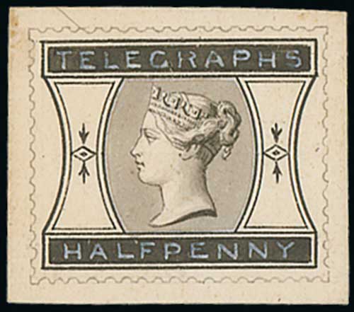 228 image1880 ½d Handpainted De la Rue essay for an anticipated second telegraphs issue, the stamp size essay superbly painted (complete with perforations) in black and Chinese white on thick card, 28x24mm. Telegraph stamps were abolished in 1881 and this proposed second issue was therefore abandoned. A magnificent and unique essay. Photo on Page 24. (Image1)