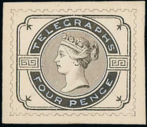 229 image1880 4d Handpainted De la Rue essay for an anticipated second telegraphs issue, the stamp size essay superbly painted (complete with perforations) in black and Chinese white on thick card, 28x24mm. Telegraph stamps were abolished in 1881 and this proposed second issue was therefore abandoned. A magnificent and unique essay. Photo on Page 24. (Image1)