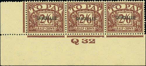232 image1924-31 2/6 Purple on yellow Q32 Control strip of three, each stamp overprinted "CANCELLED" type 33, this overprint type unlisted on this stamp by S.G, lightly mounted on the central stamp only, superb and very rare, possibly unique. Photo on Page 16. (Image1)