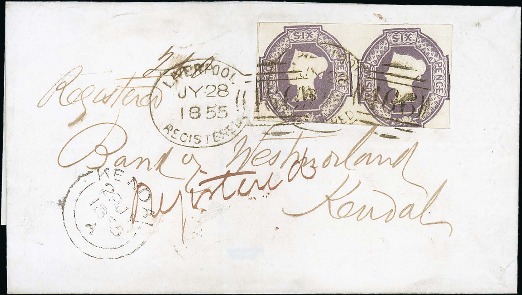 270 image1855 (July 28) Registered entire from Liverpool to Kendal franked embossed 6d pair each with three large margins, cut into at base, each cancelled by "LIVERPOOL / REGISTERED / 466" spoon, arrival datestamp on the front. An attractive use of this Registered spoon cancel. Photo on Page 38. (Image1)