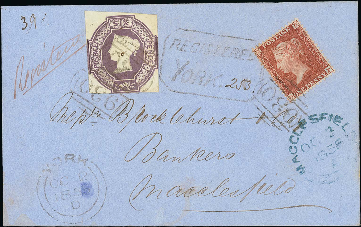 271 image1855 (Oct 2) Registered cover from York to Macclesfield franked 1d + embossed 6d cancelled "930" with boxed "REGISTERED / YORK (253)", dispatch and arrival datestamps on the front. An attractive registered cover, the 6d cut square, possibly just touched on two sides, otherwise unusually fine. Photo on Page 38. (Image1)