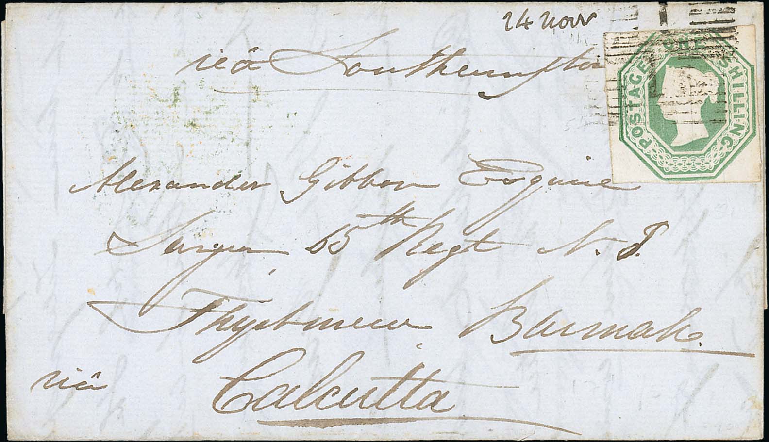 273 imageBurma. 1855 (Sep 17) Entire letter from Aberdeen to "Alexander Gibbon, Surgeon 65th Regt NI, Thyetmew, Burmah, via Calcutta", endorsed via Southampton, franked by embossed 1/-, cut square with good to huge margins on three sides, just cut into at top, tied by numeral "1". Backstamped at Aberdeen and London with boxed Calcutta Bearing datestamp showing a change of 2a. An attractive letter to Burma. Photo on Page 38. (Image1)