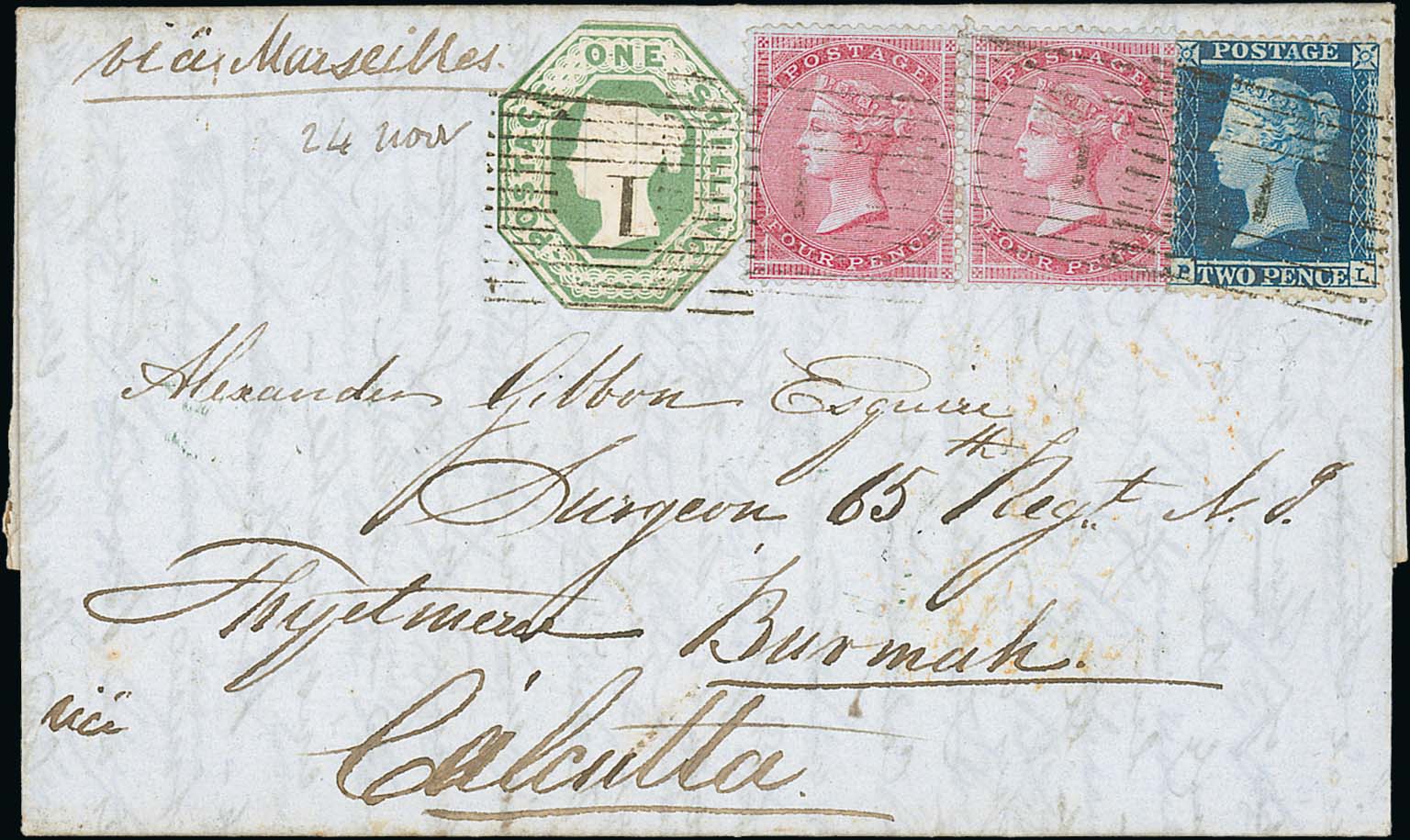 274 imageBurma. 1855 (Sep 24) Entire letter from Aberdeen to "Alexander Gibbon, Surgeon 65th Regt N.I, Theyetmew, Burmah, via Calcutta", endorsed via Marseille, franked at the 1/10 rate by 2d + 4d pair + 1/- (cut to shape) tied by "1" numerals, backstamped at Aberdeen and London with boxed Calcutta Bearing datestamp showing a charge of 1 anna. An attractive letter to Burma. Photo on Page 38. (Image1)