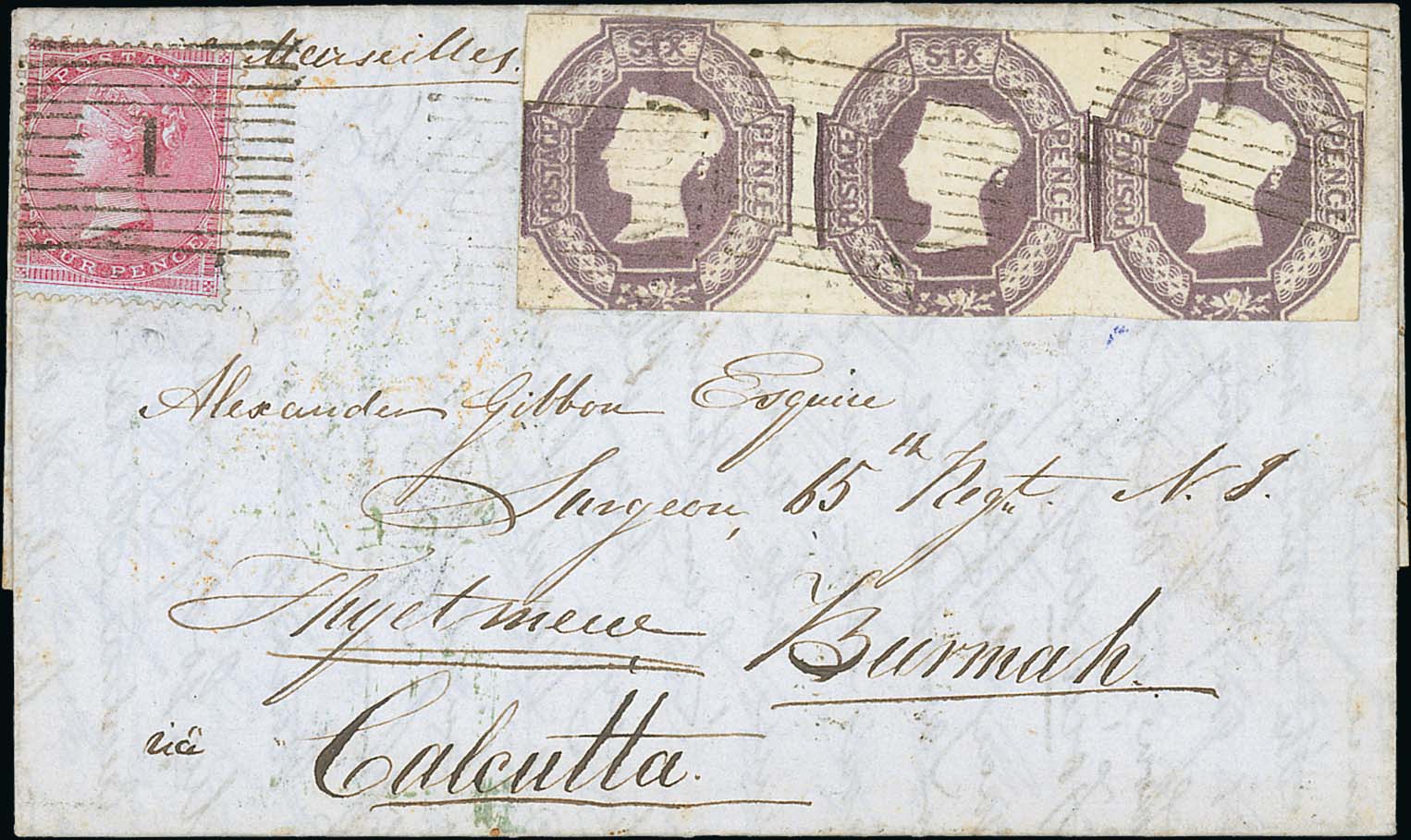 275 imageBurma. 1855 (Oct 8) Entire letter from Aberdeen to "Alexander Gibbon, Surgeon 65th Regt N.I, Thyetmew, Burmah via Calcutta", endorsed via Marseille, franked at the 1/10 rate by 4d + embossed 6d strip of three all cancelled by "1" numerals, the 6d strip cut square, cut into at base and touched in places, backstamped at Aberdeen and London with boxed Calcutta Bearing datestamp showing a charge of 2a. An attractive letter to Burma. Photo on Page 38. (Image1)