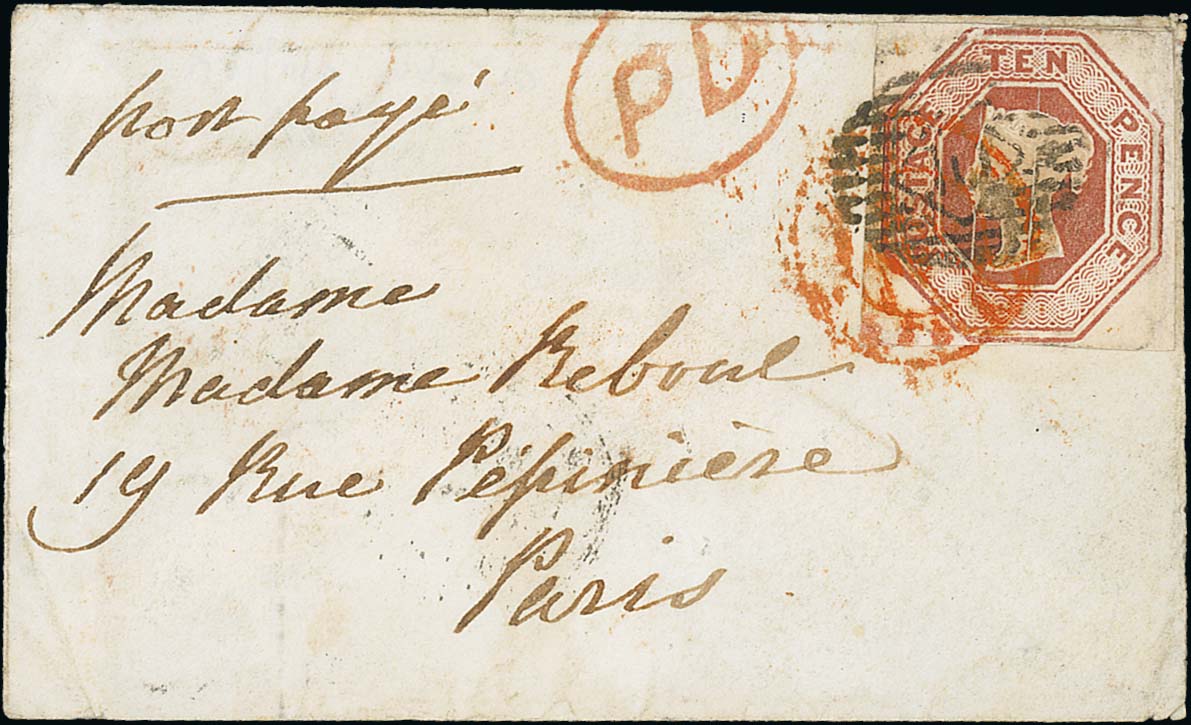 276 imageFrance. 1851 (Nov 4) Cover from London to Paris franked by embossed 10d, cut square with four margins, tied by numeral cancel and French entry datestamp, red oval "PD" alongside, an unusually fine stamp. Photo on Page 38. (Image1)