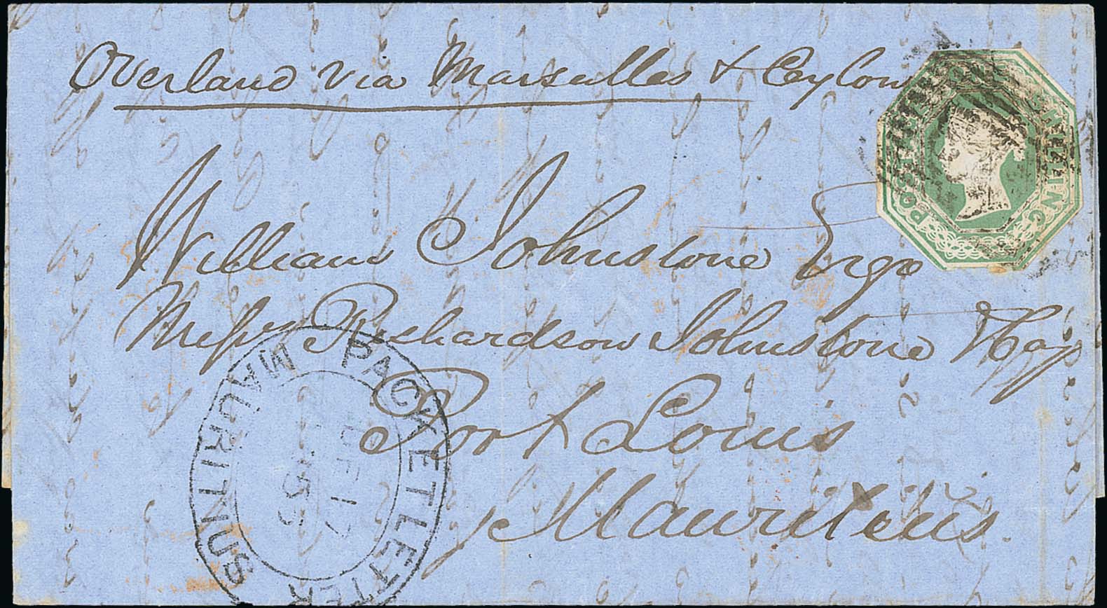 279 imageMauritius. 1855 Entire letters from Scotland to Port Louis endorsed "Overland via Marseille & Ceylon" franked embossed 1/- (cut to shape), numeral cancels "113" of Dunfermline or "205" of Kinghorn, both with oval "PACKET LETTER / MAURITIUS" datestamps on the front, attractive covers, an uncommon destination with embossed issue stamps. (2). Photo on Page 40. (Image1)