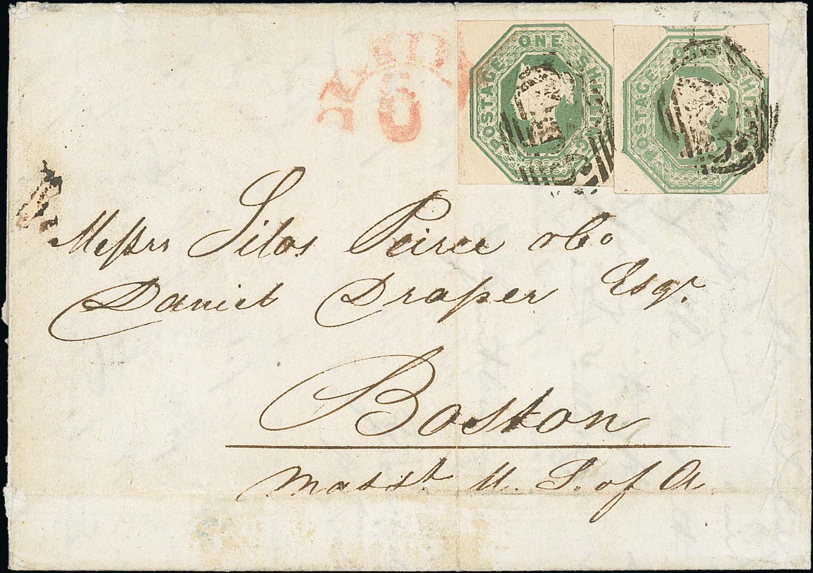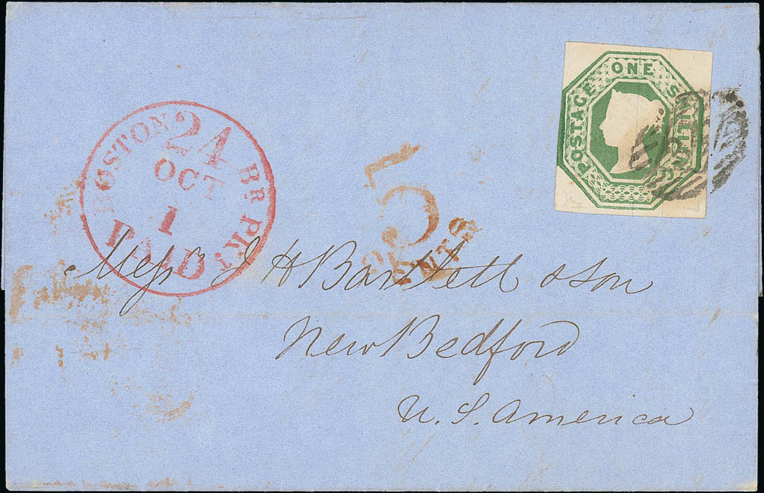 282 imageU.S.A. 1853 (Sep 9) Entire letter from London to New Bedford franked embossed 1/-, cut square with three large margins, possibly just touched at left, red "5/CENTS" and Boston Br Pkt 24 Paid c.d.s (Oct. 1), carried by Cunard "America". An unusually fine 1/- stamp. Photo on Page 40. (Image1)