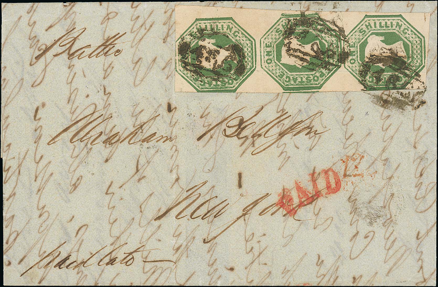 283 imageU.S.A. 1853 (Sep 21) Entire letter to New York, posted into the Liverpool Floating Receiving House paid 2/- postage + 1/- late fee bearing an embossed 1/- vertical strip of three, cut square, the upper stamp touched on two sides, the lower pair with good margins, each cancelled "466". Endorsed "Baltic" and "Paid Late" with Liverpool F.R.H backstamp, red "PAID" and "12 / CENTS", an unusually fine 1/- strip. Photo on Page 40. (Image1)