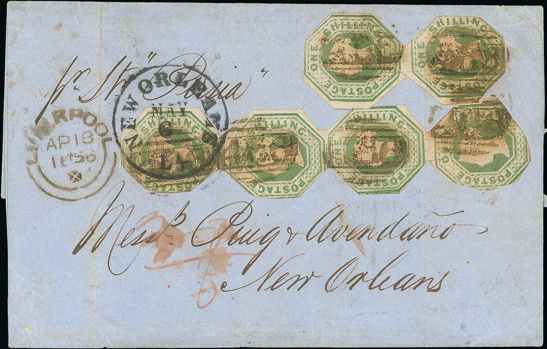 280 imageU.S.A. 1848 (Mar 15) Entire letter from Trieste to Boston forwarded to Liverpool where it was posted, the reverse endorsed "Recd 25 March P.M and forwarded 8 April by your m.o.s Henry Ede Liverpool", franked by two embossed 1/- stamps, both cut square, one just touched at base, otherwise fine with close to large margins, each cancelled "466". Despatched by private ship with red "SHIP / 6", light file folds, otherwise fine. Photo on Page 40. (Image1)