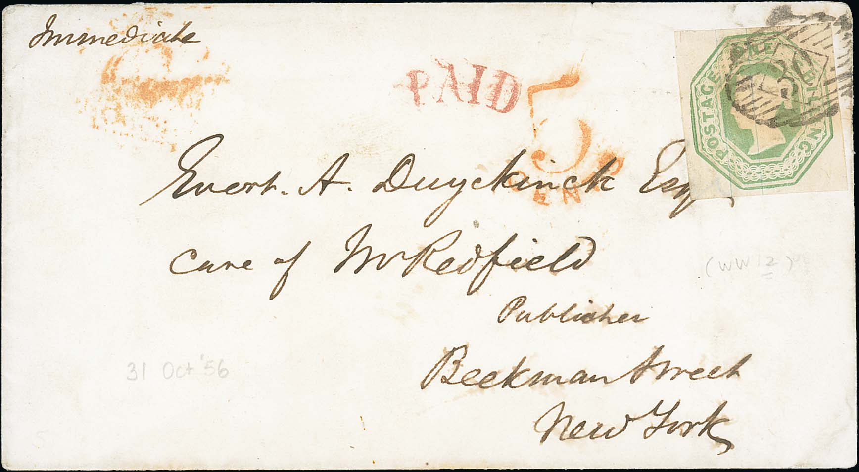 286 imageU.S.A. 1856 (Oct 31) Cover from London to New York franked 1/- embossed, cut square with large margins on all sides, carried on the Cunard "Europa". An unusually fine stamp (die W.W.2). Photo on Page 40. (Image1)