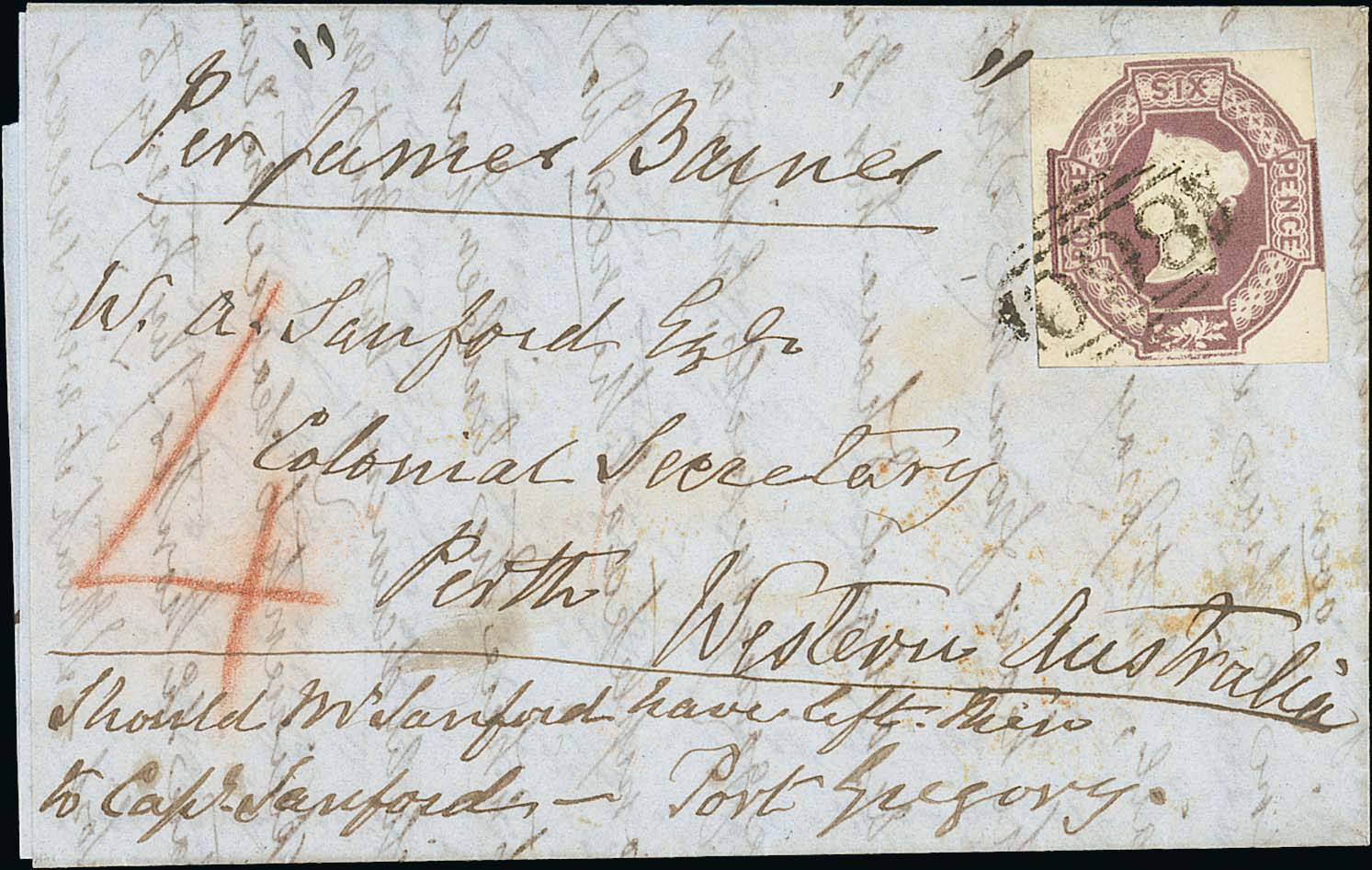 287 imageWestern Australia. 1854 (Dec 7) Entire letter from Wellington, Somerset, to "W.A Sanford, Colonial Secretary, Perth, Western Australia" endorsed "Per James Baines" and inscribed "Should Mr Sanford have left then to Capt. Sanford, Port Gregory", bearing an unusually fine cut square embossed 6d cancelled "860", 4d internal ship letter fee charged in Perth. A fine item to an uncommon destination at this early date, carried on the "James Baines" record 63 day voyage to Melbourne. Photo on Page 40. (Image1)