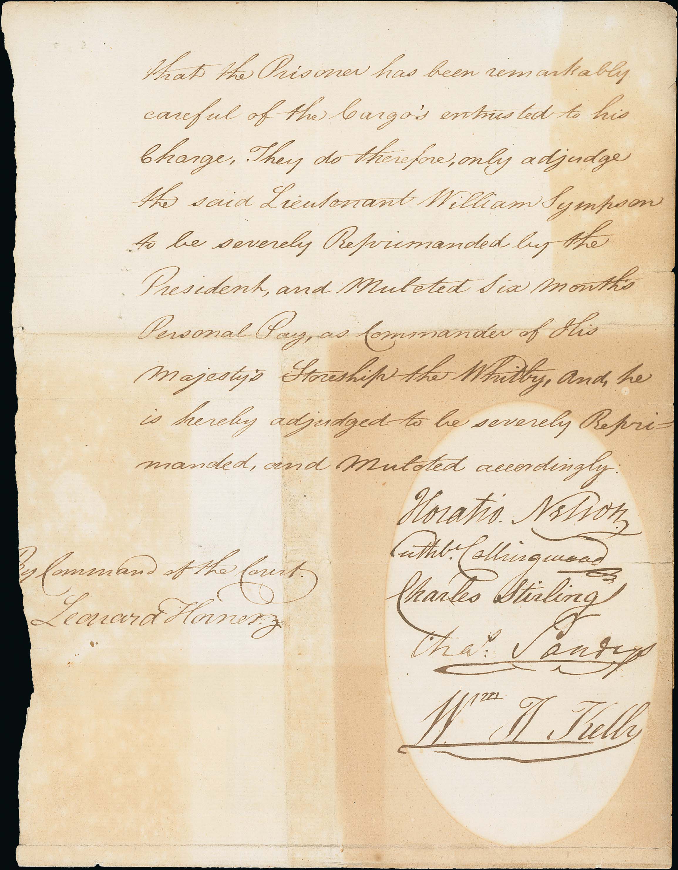 385 imageAdmiral Lord Nelson. c.1785 Part document "that the Prisoner has been remarkably careful of the cargos entrusted to his charge, they do therefore, only adjudge the said Lieutenant Sympson to be severely reprimanded by the President, and muleted six months personal pay, as Commander of His Majestys Storeship the Whitby, and he is hereby adjudged to be severely reprimanded and muleted accordingly", boldly signed "Horatio Nelson", five other signatures include Admirals Cuthbert, Collingwood and Charles Stirling. The page previously folded and the autographs displayed in an oval frame resulting in toning around the oval area previously displayed, the first page of the document missing, an accompanying collectors write up stating the document dates from 17th June 1785 and was written on H.M.S "Boreas" in Nevis Roads. A fine early Horatio Nelson signature. Photo on Page 54. (Image1)