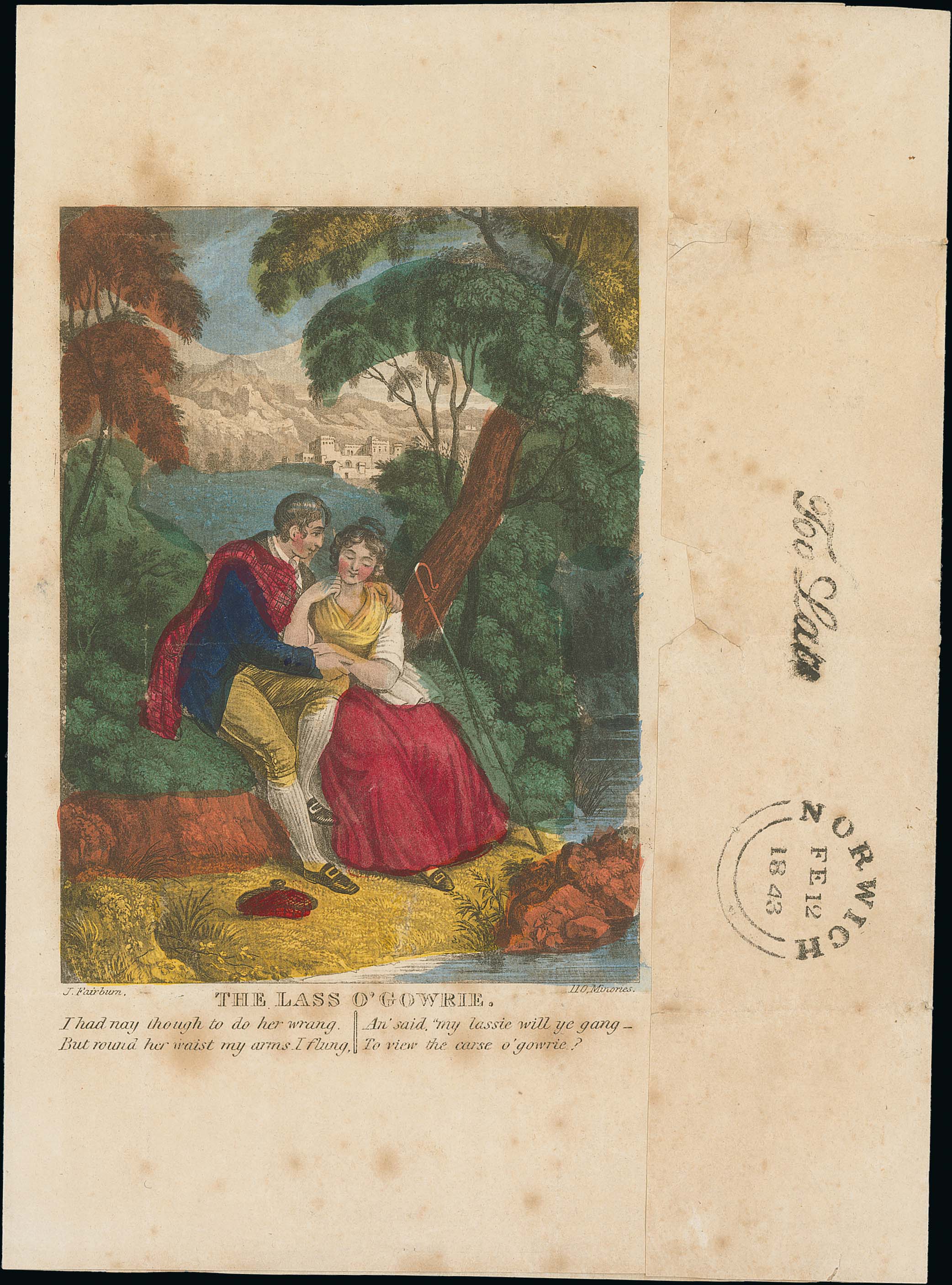 44 image1843 (Feb 12) Valentine lettersheet with a picture of two lovers in the Scottish countryside, engraved by J. Fairburn, 110 Minories, hand coloured with a verse below, entitled "The Lass O Gowrie". Posted from Norwich to "Master Edward Lubbock, Scottow Vicarage, near North Walsham" bearing a 1d red (just touched at left), reverse with Norwich datestamp and "Too Late". A fine and attractive valentine which can be folded to display the picture and backstamps. Photo on Page 8. (Image1)