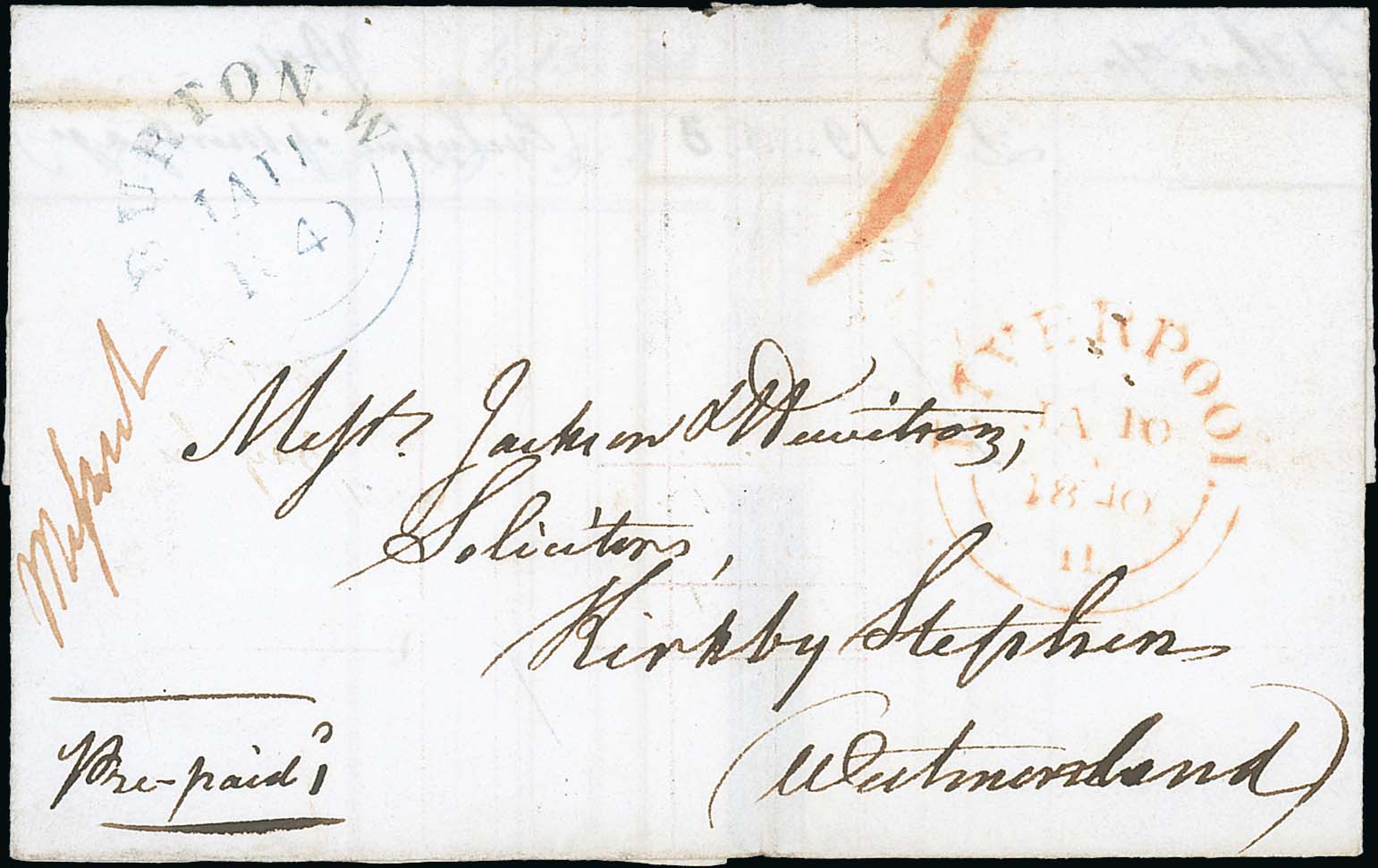 534 image1840 (Jan 10) Entire letter containing an account for December 1839, posted from Liverpool to Kirkby Stephen on January 10th 1840, the first day of Uniform Penny Postage, prepaid 1d in cash with red handstruck "1" and a JA 10 datestamp, manuscript "missent" alongside a Burton W datestamp (JA 11), endorsed "pre-paid 1d". Horizontal file fold close to the upper edge and lower flap removed (with no loss to the letter or any handstamps), an attractive and rare Uniform Penny Post first day cover. Handstruck "1" marks are only recorded on the first day from London and Liverpool; "International Postal Reform" by James Grimwood-Taylor records seven Liverpool examples, four of which are in museum collections. Photo on Page 72. (Image1)