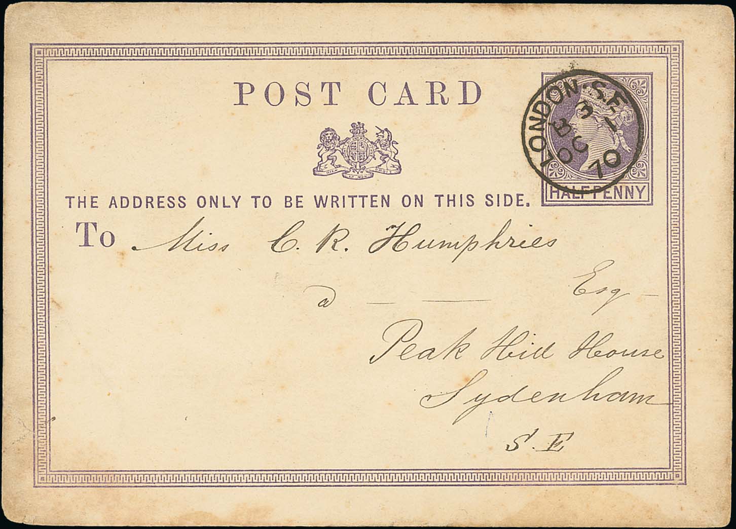 539 image1870 (Oct 1) ½d Violet postcard, large size card used within London on the first day of issue cancelled by superb London S.E c.d.s, the message starting "Partly as a curiosity on the first day of their issue I send one of the new postage cards". First Day uses of these large size cards are much scarcer than the smaller size cards, with most first day uses having pre-printed adverts, private uses such as this purchased on the day. A few minor edge soils, otherwise fine. Photo on Page 72. (Image1)