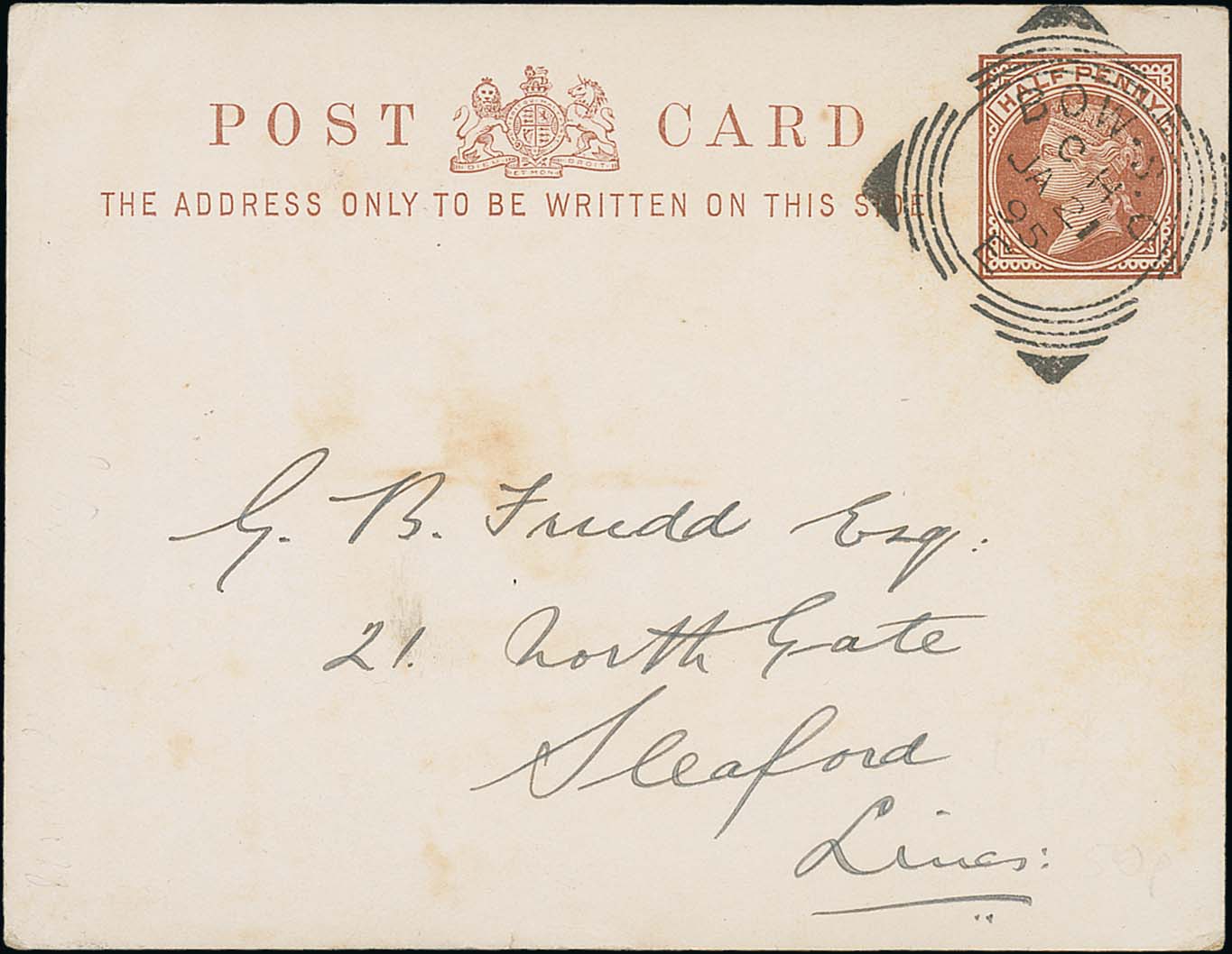 545 image1895 (Jan 21) ½d Brown postcard posted on the first day of issue from London to Sleaford, cancelled by "BOW S.O / E" squared circle, message reads "For your collection", fine and rare. Photo on Page 78. (Image1)