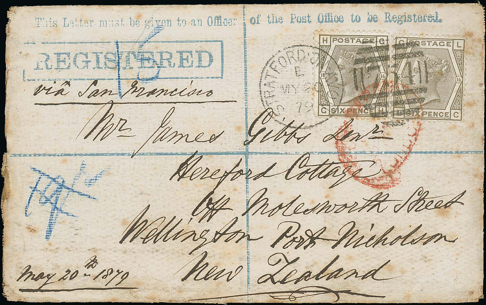 546 image1879 (May 20) 2d First type F size registration envelope with "REGISTERED" in serifed lettering, posted from Stratford on Avon to New Zealand via San Francisco franked by two 6d grey plate 16 stamps, Wellington (July 4) arrival backstamp. A scarce item of postal stationery and an exceptional use to New Zealand. Photo on Page 78. (Image1)