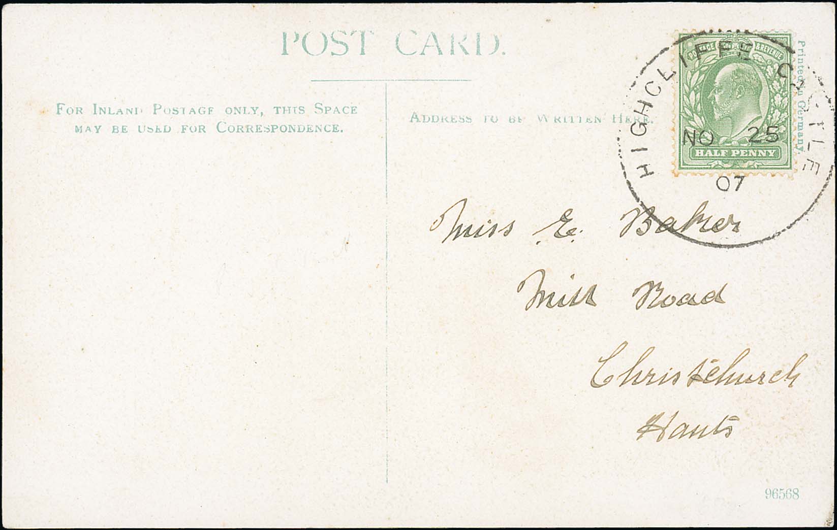 577 image1907 (Nov.) Picture postcards, a Nov. 15 postcard from J.C Barlerin with KEVII ½d cancelled at Windsor and a "WINDSOR CASTLE" c.d.s on the address side, sent on the day the German Emperor Kaiser Wilhelm stayed at Windsor Castle; the second card of Highcliffe Castle with KEVII ½d tied by superb Nov. 25 "HIGHCLIFFE CASTLE" skeleton datestamp, used at the temporary post office at the castle during the visit of the German Emperor from Nov. 18th - Dec. 9th. (2). Photo on Page 82. (Image1)