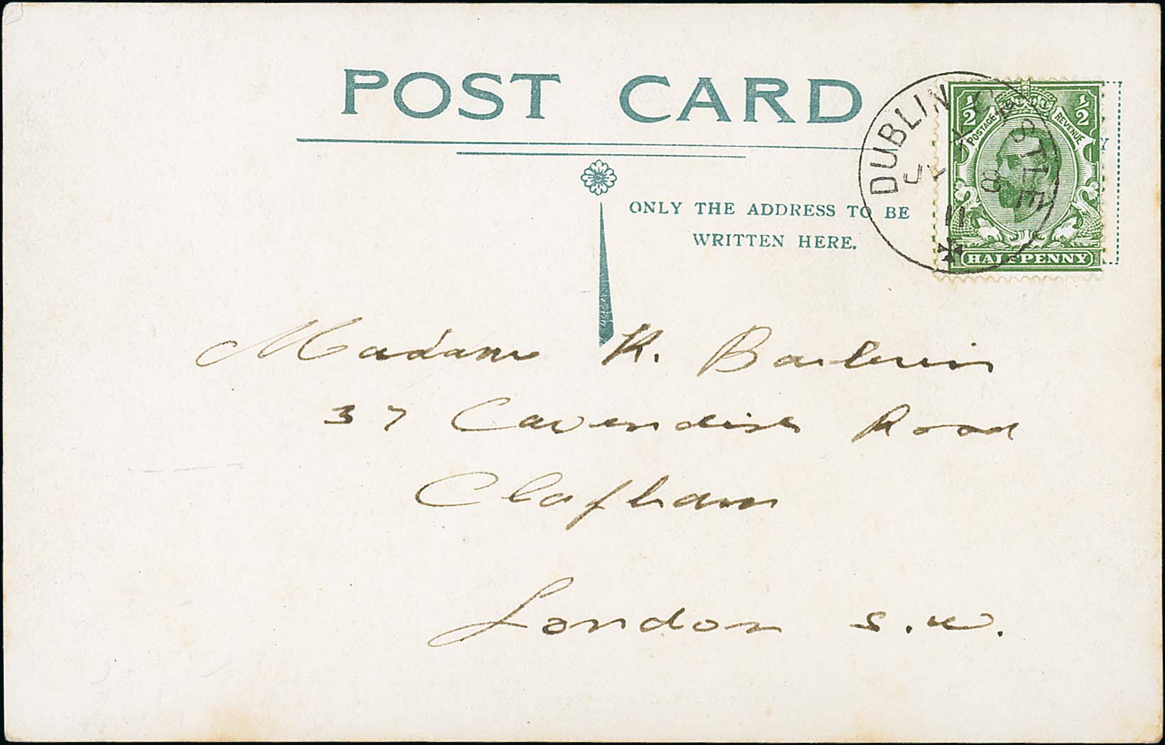 578 image1911 (July 8) Picture postcard of the royal visit to Dublin, sent by J.C Barlerin, Comptroller of Supply, to his wife in London, a KGV ½d cancelled by "DUBLIN CASTLE / +" c.d.s. A temporary telegraph office was opened for the King s five day visit to Dublin (July 8-12) shortly after his Coronation, the special Dublin Castle c.d.s however only recorded as a cancel on a few postcards sent by Barlerin. Very scarce. Photo on Page 82. (Image1)